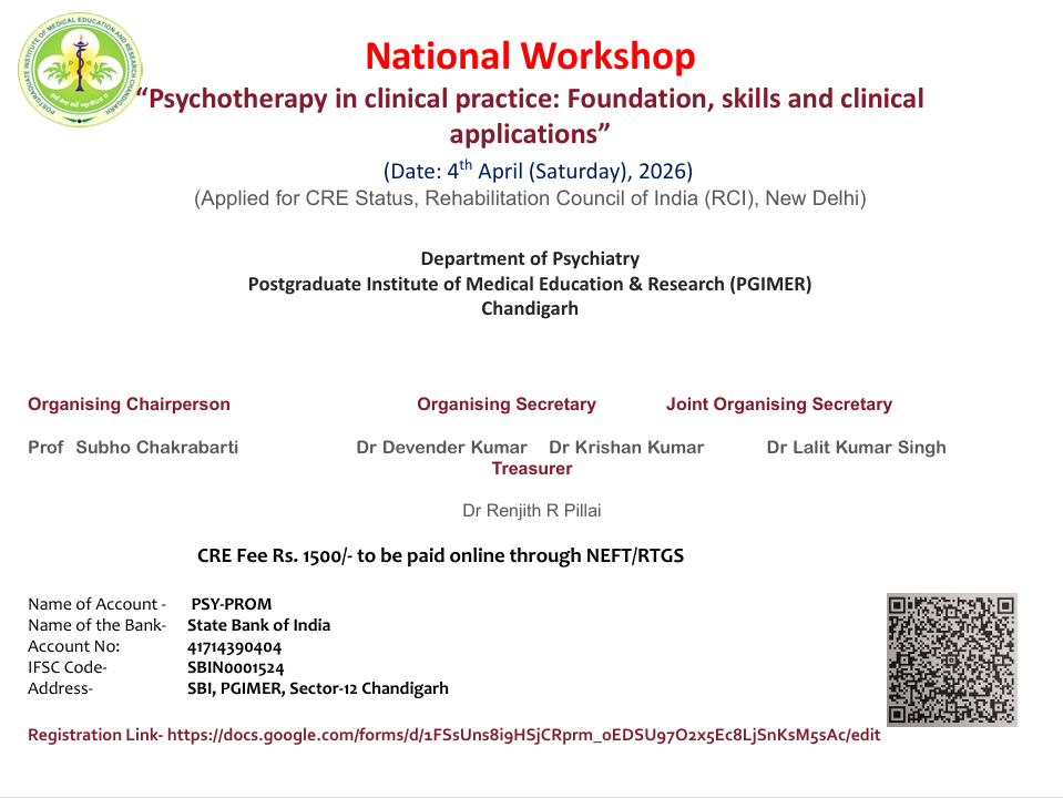 ContactThe Department of Psychiatry is one of the earliest general hospital psychiatry units started in the country in 1963 by Prof. NN Wig in the PGIMER, an institute of national importance created under an Act of Parliament. This Department is the most prestigious and a coveted centre for training and research in mental health in the country offering specialty training in general psychiatry, and super specialty training in Addiction Psychiatry, Child and Adolescent Psychiatry, and Consultation Liaison Psychiatry. The Department also offers PhD in Psychiatry and Clinical Psychology. The Department has been WHO centre for Research and Training in mental health for South East Asia Region, as well as a Centre of Excellence for De addiction and Treatment Services in the country.